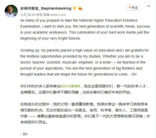 霍金在微博中表示,“你们中的许多人即将参加2016年高考,我在这里祝愿你们,新一代的科学人才,金榜题名。这是你们勤学不辍的顶峰,也标志着你们美好未来的开始”。