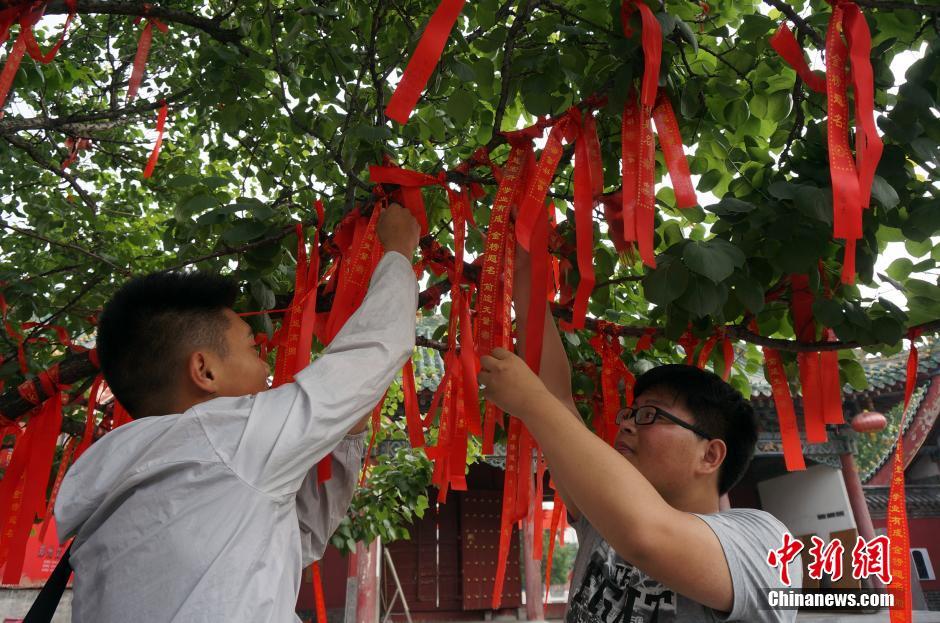 6月6日,河南郑州,不少即将参加高考的学子来到郑州文庙祈福,希望可以“金榜题名”。当日下午,看过考场后,前来文庙祈福的学子络绎不绝,有的家长陪伴,有的结伴好友而来,他们上香祭拜孔子、系红色祈福飘带、悬挂许愿牌,希望能够借此减轻考前压力,积极调整心态,坚定信念,祈愿考场发挥出色、得偿心愿。郑州文庙始建于东汉,是中国现存第二古老的孔庙,每年高考前夕,都会有不少高考考生和家长变身临时香客,到此祭拜、祈福。图为高考学子在许愿树上系上祈福飘带。 周小云 摄