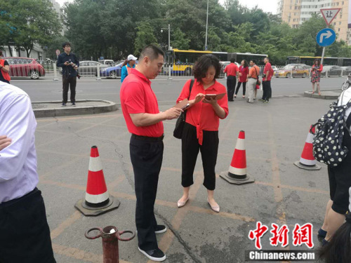 2016年6月7日,人大附中考场外,有家长专门穿红衣“送考”。 张尼 摄