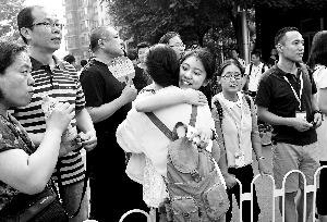 广渠门中学考点,高考结束,同学相拥。北京晨报记者 李木易/摄