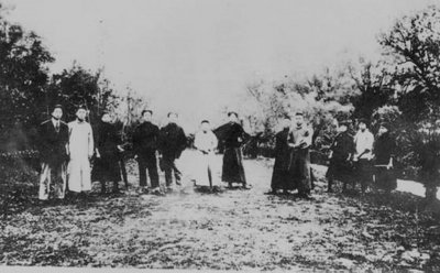 1920年5月8日毛泽东送萧三、劳君展等6位会员赴法国勤工俭学,在蒙蒙细雨中的上海半淞园合影留念。左起:萧三、熊光楚、李思安、欧阳玉生、陈绍休、陈纯粹、毛泽东、彭璜、刘望成、魏壁、劳君展、周敦祥。(资料照片)