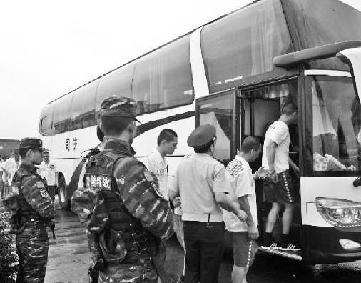 7月5日9时32分,九成监狱泊湖监区的监管大门缓缓打开,第一批5辆押解148名服刑人员的车辆徐徐开出,跟随着武警押解护卫车队驶入沉沉的雨幕中。
