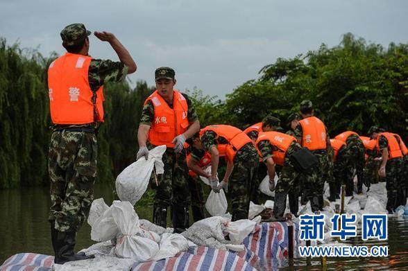 7月5日,武警水电部队官兵在决口处填补砂袋,加固河堤,确保合龙成果。 7月4日,江苏常州市武进区湟里镇东安村庙渎浜河东岸1公里处发生决口,长度约20米,导致下游近3000亩良田被淹,2000多户居民受灾。接到救援命令后,武警水电部队160余名官兵奋力封堵决口,经过近20小时苦战,基本完成决口合龙。 新华社记者 季春鹏 摄