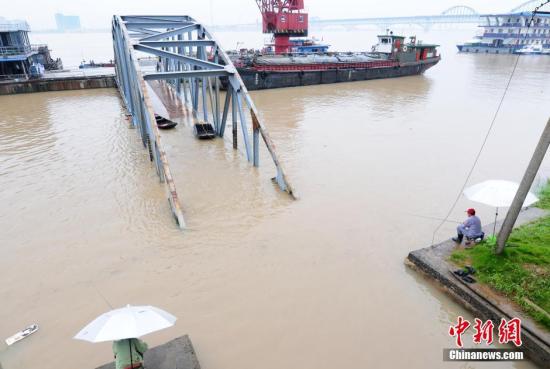 7月5日,市民在超过警戒线水位的长江江西九江段码头钓鱼。 胡国林 摄