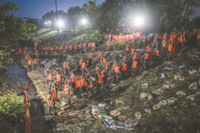 受持续强降雨影响,溧阳市社渚镇多处堤坝4日夜间出险。该镇河口村和上游汹涌来水间,只有一道薄薄的堤防,还有天刚亮就赶到的武警常州支队50名官兵。暴雨不停,水位持续上升,拍打防洪堤的波涛冲出一道5米多宽的缺口。水流湍急,沙袋刚垒上就被冲走,眼看口子越来越大,官兵们奋不顾身跳入没过胸口的水中,背向洪流护住刚垒上的沙袋,同时不断填沙袋、打木桩,辅以木板、砖块加固。官兵们喊着口号往来穿梭,不断将堤坝抬高,但用不了多久,水位线又会悄悄赶上来。