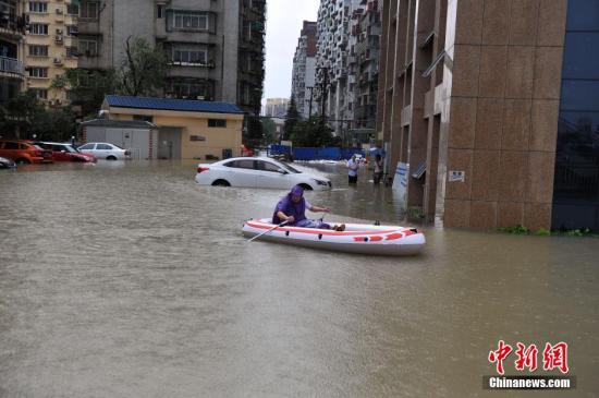 7月6日,武汉市民划着皮划艇出行。当日,武汉市防汛办提供的最新信息显示,5日开始武汉市普降大暴雨,局部特大暴雨,6日武汉国家基本气象站记录的数据显示武汉主城区14小时降雨229.1毫米。从6月30日至7月6日,武汉国家基本气象站记录的本轮强降雨已累计降下560.5毫米,一周持续降水量突破该市有气象记录以来最高值。中新社记者 张畅 摄