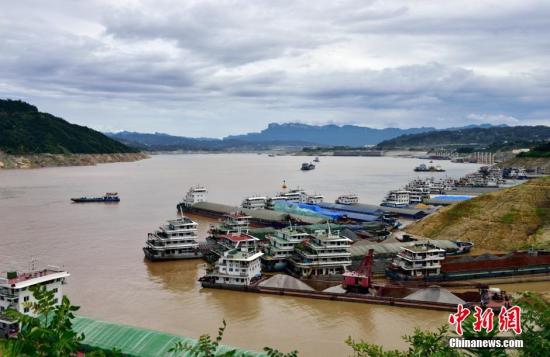 7月1日14时,三峡入库流量达50000立方米每秒。这是今年入汛以来,三峡水库迎来的最大洪峰。洪峰过境时,三峡水库发挥拦洪削峰功能,削减了近四成的洪水流量。目前三峡库区和三峡河段通航正常。图为船舶在三峡库区秭归县码头靠泊。 中新社记者 王家满 摄