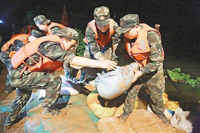 武警景德镇支队第一梯队58名官兵先期赶往出险地段处置。在水利专家的指导下,官兵们在渗水堤段开挖排水沟,并扛运砂石加固堤防,初步稳定了险情。