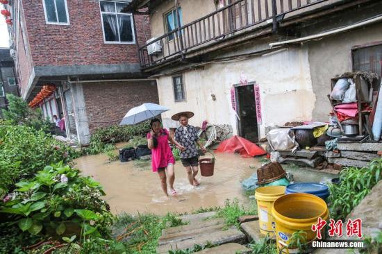 7月8日夜间开始,“尼伯特”便为福建带来疾风骤雨。据8日7时至9日7时统计,全省降雨量50~100毫米有6个县(市、区),超100毫米有10个县(市、区),以城厢区266毫米为最大。受强降雨影响,福建莆田市、福州市永泰县、闽清县等多地发生严重内涝。在重灾区莆田市荔城区新度镇,多处道路、民房均被淹,导致多人被困,当地消防官兵推船进村、救出被困民众。图为莆田市新度镇沟尾村村民蔡碧蓉拉着老人从危房中撤离出来。 汤珺琳 摄