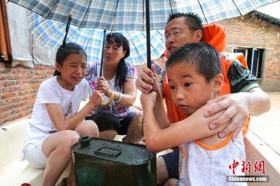7月8日夜间开始,“尼伯特”便为福建带来疾风骤雨。据8日7时至9日7时统计,全省降雨量50~100毫米有6个县(市、区),超100毫米有10个县(市、区),以城厢区266毫米为最大。受强降雨影响,福建莆田市、福州市永泰县、闽清县等多地发生严重内涝。在重灾区莆田市荔城区新度镇,多处道路、民房均被淹,导致多人被困,当地消防官兵推船进村、救出被困民众。图为莆田市新度镇沟尾村村民被救出。 汤珺琳 摄