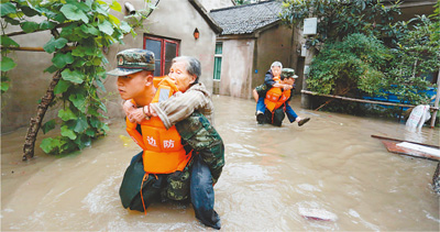 7日,武警江苏边防总队官兵在南京紧急转移群众。丁海洲 章善玉摄影报道(人民视觉)