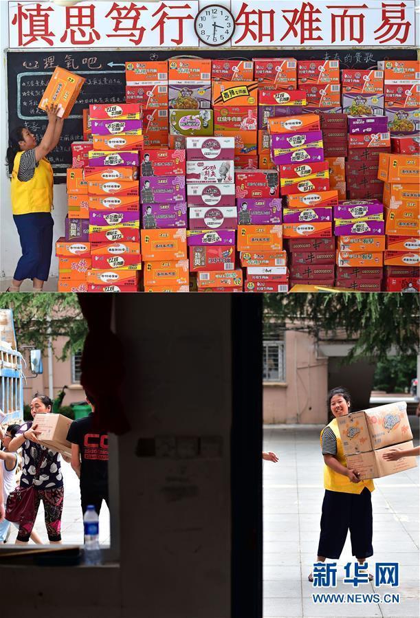 7月10日,“00后”15岁的叶淑婉在水灾发生后第一时间来到安徽省宣城市第十二中学成为了一名志愿者,协助救灾人员收发食品及物资。新华社记者 刘军喜 摄