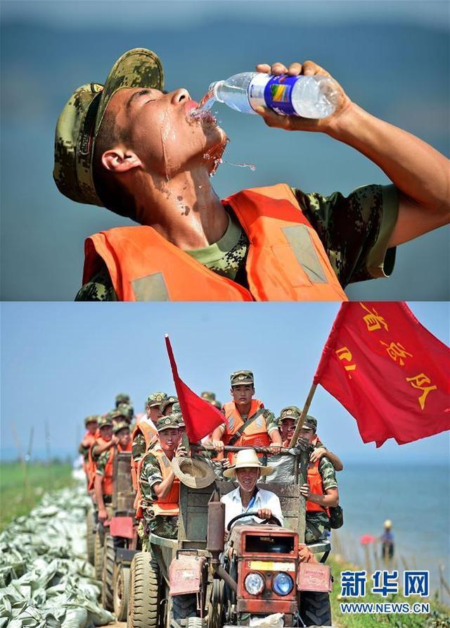 (上图)7月8日,“95后”武警战士邓聪在安徽省池州市东至县白沙洲村升金湖大堤上喝水。