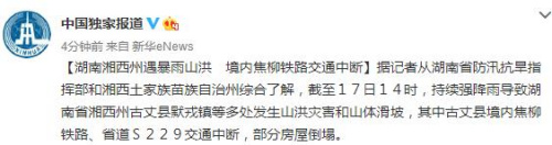 据记者从湖南省防汛抗旱指挥部和湘西土家族苗族自治州综合了解,截至17日14时,持续强降雨导致湖南省湘西州古丈县默戎镇等多处发生山洪灾害和山体滑坡,其中古丈县境内焦柳铁路、省道S229交通中断,部分房屋倒塌。