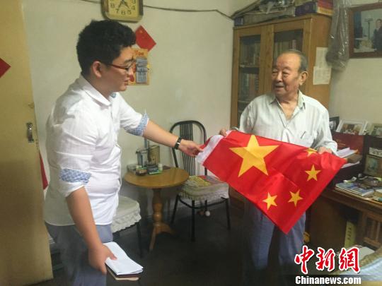 邢燕老人向记者展示他收到的国旗。 张帆 摄