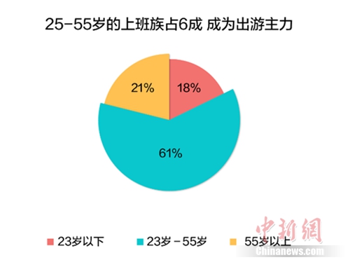 从出游人群看,上班族、家庭、女性成为关键词。携程的大数据显示,平时假期有限的上班族在黄金周集中“爆发”,年龄段在23-55岁之间的群体占到出游总人数的6成以上。90、00后崛起,占比18%。55岁以上的中老年人也习惯通过网站报名,占了21%。女性游客成为出游主力,占比59%,比男性高18个百分点。报告分析称,女性主导旅游的时代来临。