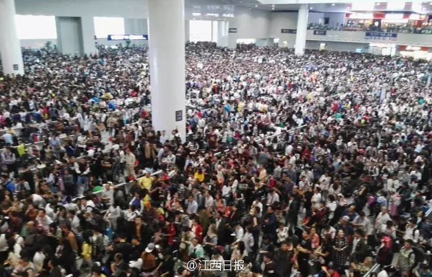 图为9月30日,南昌火车站人山人海。