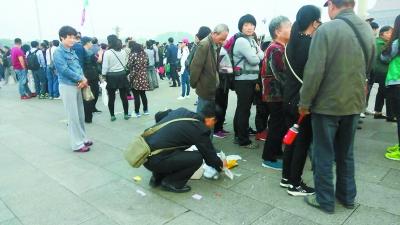 旁边的一些游客看到后,也纷纷加入进来。他们弯下腰,把附近的垃圾捡来,堆成一堆,等待清洁工人来清理。虽然只是堆起来,但这已经大大减轻了清洁工人的劳动量。自发捡垃圾的行为,在广场上感染着越来越多的游客,大量游客加入到自发捡垃圾的行动中。 董振杰摄