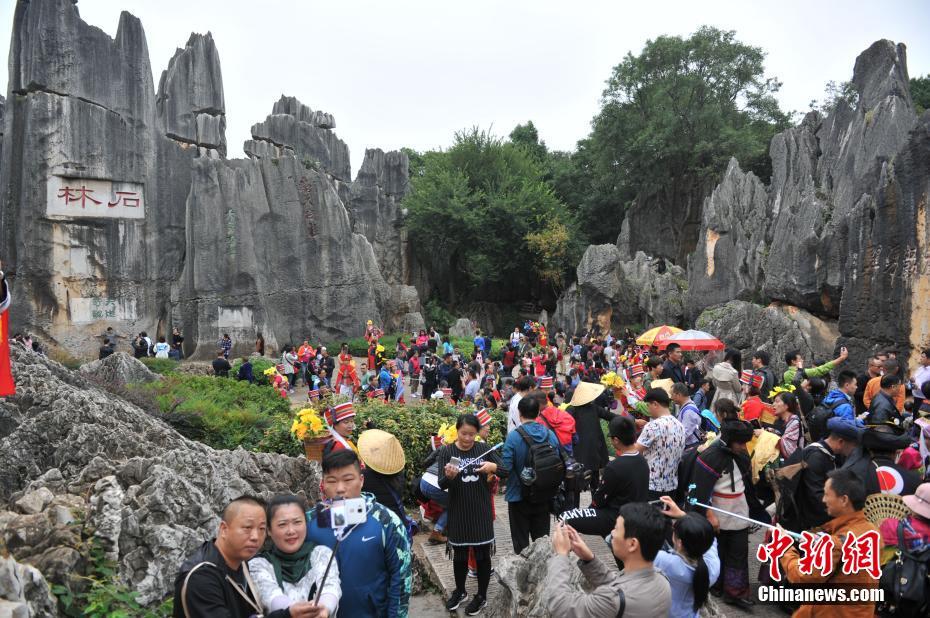 10月1日,云南石林风景名胜区内游客扎堆拍照留念。据石林风景名胜区管理局介绍,预计当日进入石林的游客近1.4万人,比去年同期增长5.2%。中新社记者 任东 摄