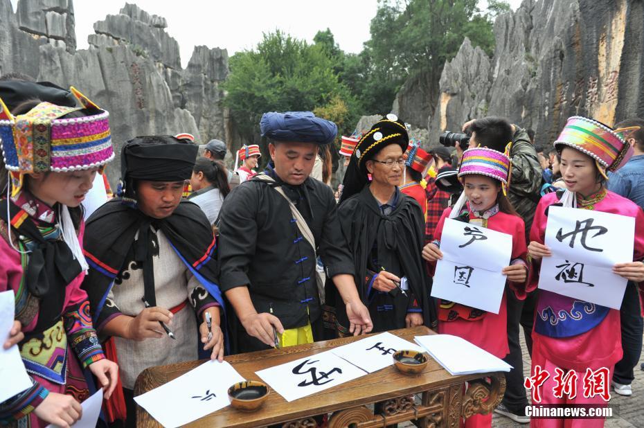 10月1日,云南石林风景名胜区内几位彝族毕摩现场书写彝语“祖国生日快乐”迎接国庆节到来。中新社记者 任东 摄