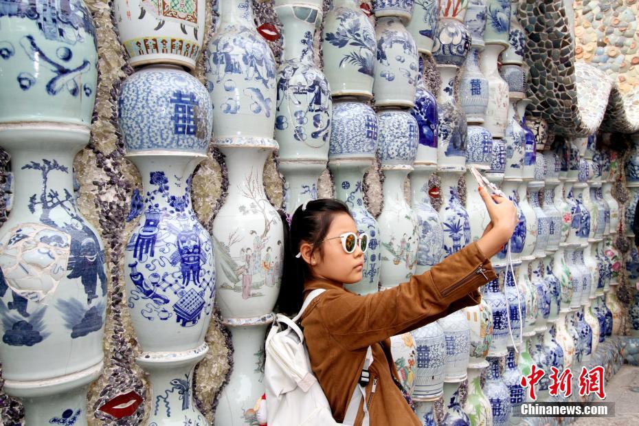 10月1日,“十一”黄金周首日,位于天津市和平区赤峰道上的“神奇建筑”瓷房子迎来客流小高峰,近万游客到访参观游玩。图为一位女孩在自拍。中新社记者 张道正 摄