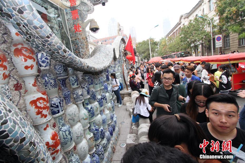10月1日,“十一”黄金周首日,位于天津市和平区赤峰道上的“神奇建筑”瓷房子迎来客流小高峰,近万游客到访参观游玩。图为游客排队进入瓷房子博物馆。中新社记者 张道正 摄