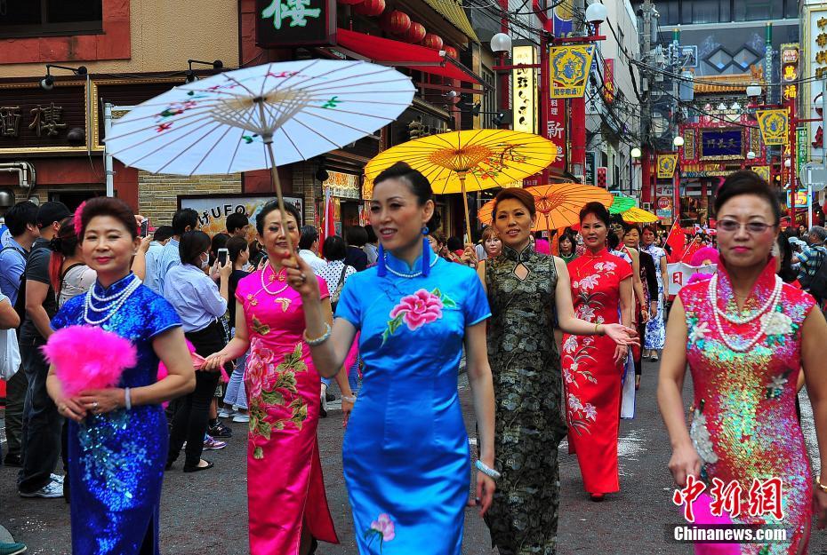 在著名华埠日本横滨中华街街区,当地侨胞为庆贺中华人民共和国67周年华诞,10月1日举行了一系列丰富多彩的活动。图为一群身着各色华丽旗袍的侨界妇女结伴“丽人行”,吸引沿街关注目光。中新社记者 王健 摄