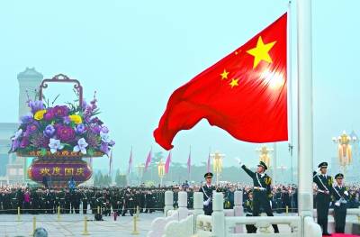 昨天早上6时10分,天安门广场奏响《义勇军进行曲》,在十多万双眼睛的注视之下,国旗护卫队升旗手升起五星红旗。 本报记者 和冠欣摄