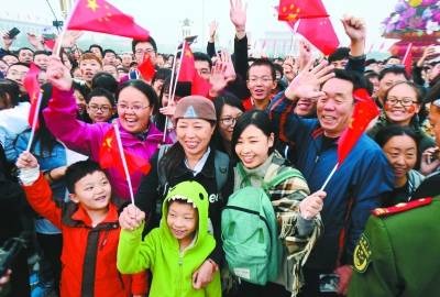 昨天早上,在天安门广场上,一家6口挥动手中的国旗祝福祖国繁荣昌盛。当天有11万名群众在广场上观看升旗仪式,共同庆祝新中国67岁生日。本报记者 和冠欣摄