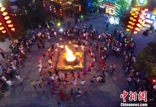 游客在武陵源溪布老街跳起摆手舞,共享篝火盛宴。 吴勇兵 摄