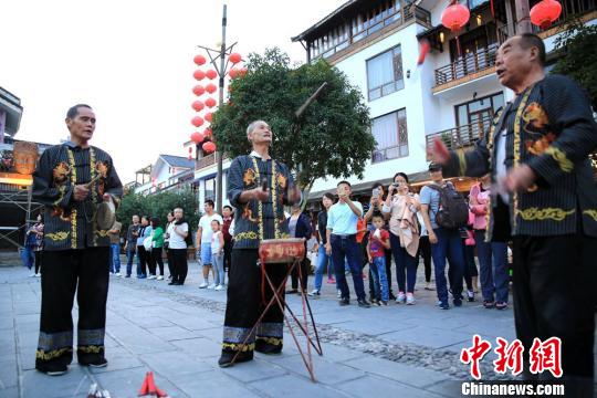 在武陵源溪布街,民间艺人为游客表演三棒鼓。 吴勇兵 摄