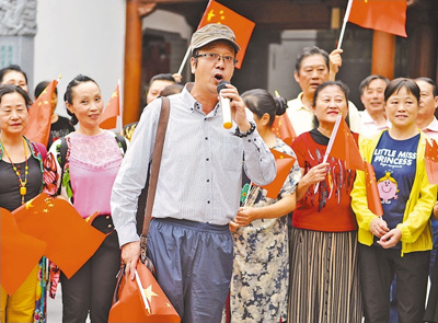 在安徽合肥市城隍庙南门广场,来自四面八方的游客挥舞着国旗,尽情合唱《我的祖国》《祖国你好》等脍炙人口的歌曲。 孙 振 陈 晨摄影报道