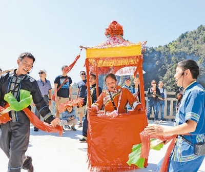 在四川万源八台山景区,游客观赏民俗表演。王明峰 陈国岳摄影报道