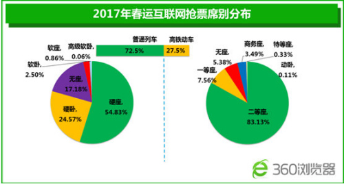 近年来,我国铁路建设高速发展,动车高铁的出现为用户出行提供了更多选择,《报告》显示,2017年春运有27.5%的用户选择了高铁动车,其中有80%的旅客购买了二等座车票,无座率仅为5.38%。但由于价格、车次等原因,乘坐普通列车的旅客数还是明显高于高铁动车,相应的其抢票难度也大幅提升,无座率高达15%。