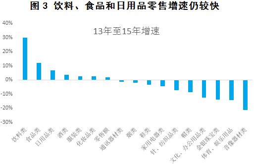 在各消费品行业中,饮料、食品和日用品增速较快,其中饮料类零售额在2013年至2015年增速将近30%,显示出勃勃的生机。