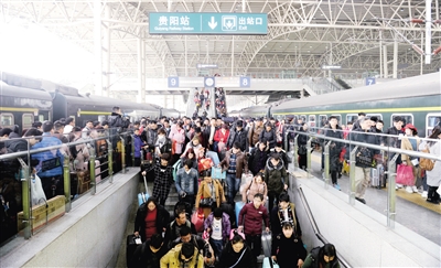 图为1月25日,到达旅客在西南铁路枢纽贵阳火车站出站。新华社记者 陶亮 摄