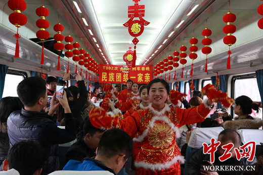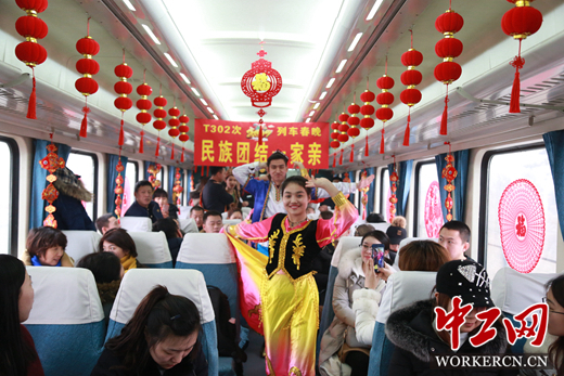 中工网讯(记者 彭冰 通讯员 孙红梅) 1月26日上午,长春开往乌鲁木齐的T302次列车上,到处洋溢着幸福祥和的节日气氛。编织精致的中国结,红红的大福字,喜庆欢快的民族音乐,彩裙飞扬的各式舞蹈——,沈阳铁路局长春客运段的干部职工与这趟列车的共建单位-对口援疆学校长春希望高中的少数民族学生为乘车的各民族旅客共同献上一台列车春晚。