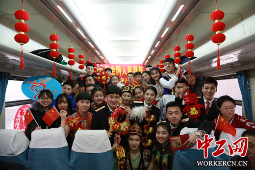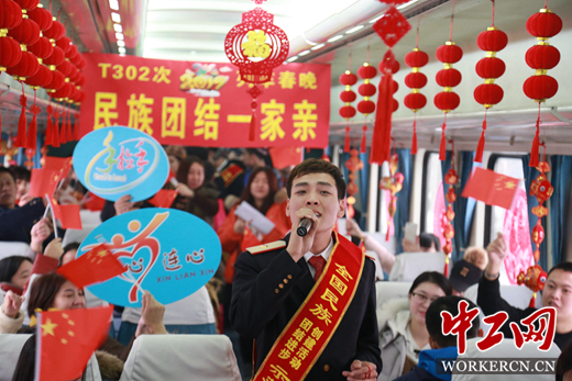 歌伴舞《美丽中国走起来》伴随着列车的行进,在节奏欢快的的音乐声中拉开了春晚帷幕。“我们这趟列车是全国民族团结进步创建活动示范单位,沿途有47个少数民族地区,过年了,我们就是想为行走在回家路上的少数民族旅客做一点什么。”车队总支书记王国平说道。具有民族特色的哈萨克族、维吾尔族舞蹈活跃了车厢气氛,旅客们情不自禁地参与其中,共同载歌载舞。东北师范大学的大一学生麦尔哈巴说:“平时总在电视上看春节晚会,没想到在回家的旅途中看到了家乡人表演的列车春晚,真是很亲切很开心。” 四名“90后”列车员小伙子们表演的群口快板,通过报站名、说风光、讲故事的形式,与旅客猜题互动,送福字,吸引旅客们兴高采烈、竞相抢答。