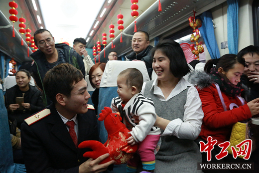 图为列车乘务员为小朋友送上鸡年的吉祥物。