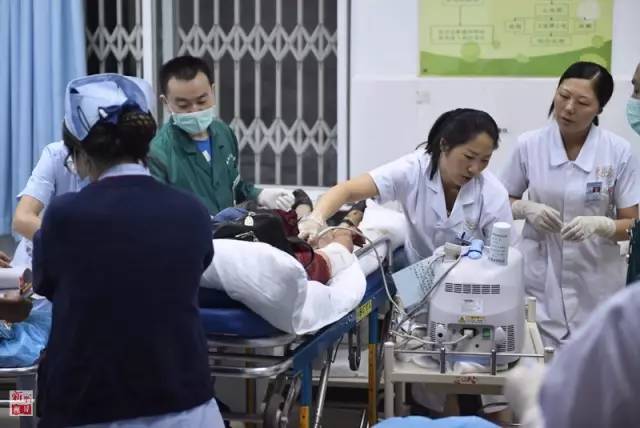 九寨沟县人民医院医护人员救治地震伤员(8月9日凌晨摄)。新华社记者刘坤摄