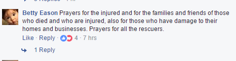 名叫贝蒂·伊森网友表达了对遇难者及其家属的哀悼,并祈祷所有伤员和救援人员平安。(图片来源:脸谱网截图)