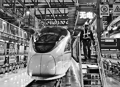 上海动车运用所的工作人员在检修列车。本报记者 鲁元珍摄/光明图片