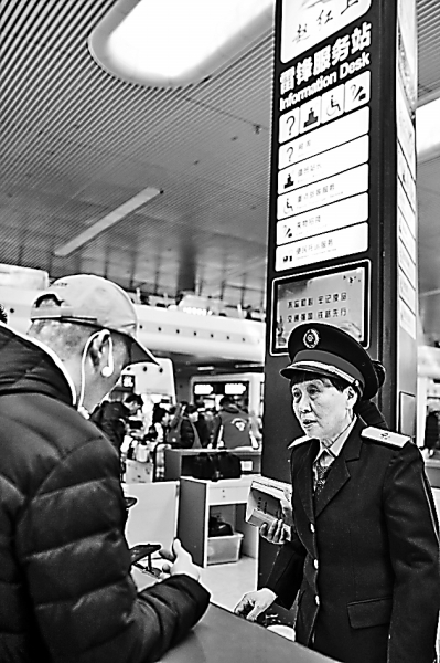 2月6日,已退休13年的赵红卫重新穿上铁路制服,在杭州东站“赵红卫服务台”再次为旅客答疑解惑。 吴崇远摄/光明图片