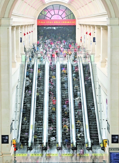 2月10日,中国铁路武汉局集团公司共加开客车113列,其中加开武汉至上海、合肥、广州、重庆等地的“夜行高铁”7列。 2月10日,春运第10天,用多次曝光模式拍摄的汉口火车站内自动扶梯上乘客川流不息的影像