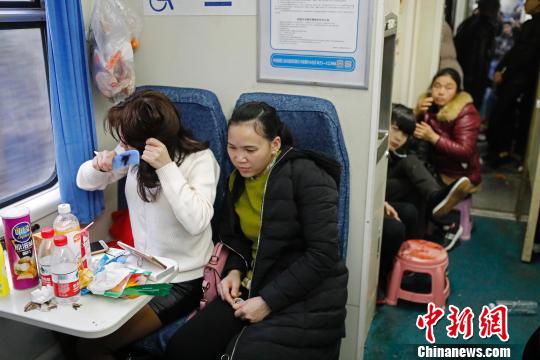 旅客坐在车厢内,打扮着自己。 殷立勤 摄