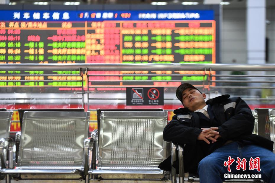 2月12日凌晨,一名候车的旅客在广州火车站内熟睡。 中新社记者 廖树培 摄