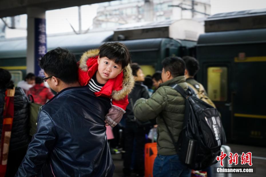 2月12日上午,广州火车站站台上,一名男子把孩子扛在肩上。 中新社记者 廖树培 摄