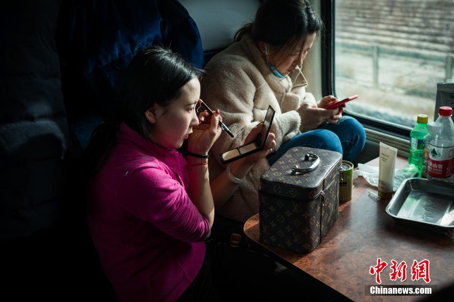 2月13日,一名旅客坐在车厢内,打扮着自己。历经21小时,1956公里的跋山涉水,由铁路拉萨站开往成都的Z324次列车,13日15时19分抵达西宁站,完成雪域“天路”——青藏铁路段的行驶,八百余名旅客顺利完成春运“大迁徙”。青藏铁路被誉为“天路”,起于青海省西宁市,途经格尔木市、昆仑山口,翻越唐古拉山口,最终抵达拉萨。是世界海拔最高、在冻土上路程最长的高原铁路。 中新社记者 何蓬磊 摄