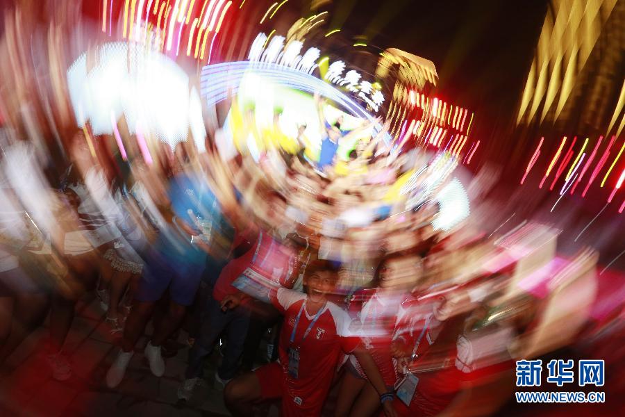8月15日晚,以“我们来欢聚”为主题的欢迎晚会在南京青奥村广场举行,来自全世界的青少年运动员一起联欢,尽情释放青春的欢乐与激情。图为晚会现场。 新华社记者任正来摄