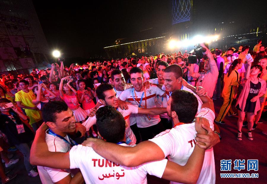 8月15日,突尼斯运动员在晚会上跳舞。当晚,以“我们来欢聚”为主题的欢迎晚会在南京青奥村广场举行,来自全世界的青少年运动员一起联欢,尽情释放青春的欢乐与激情。新华社记者燕雁摄